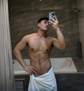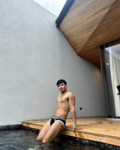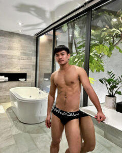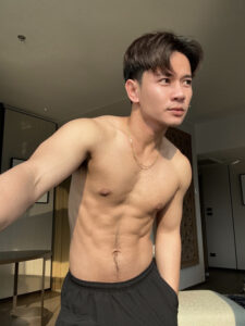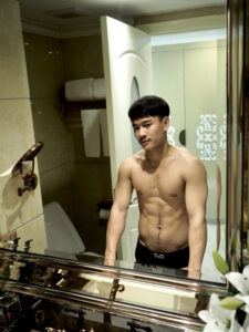 นั่งอยู่ บนเก้าอี้ ข้างเตียง ใส่กางเกง ในตัวเดียว สีดำเด่นสุดตา เพราะที่ ภาพออกมาดูดี นั้นจะบอกว่า กล้ามเด่นชัด กล้ามแขนเป็นมัดๆ บวกกับ กล้ามหน้าอก ซิคแพค